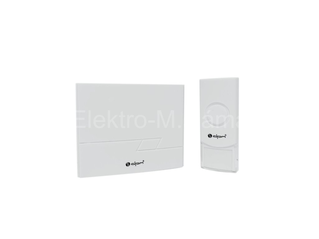 Bezdrátový zvonek na baterie. Provozní dosah v otevřeném prostoru až 50 m. 16 zvuků. Napájení: přijímač (2 x AA), vysílač (1 x 23 A). IP20 přijímač, IP44 vysílač. Bílá barva. Balení: blistr