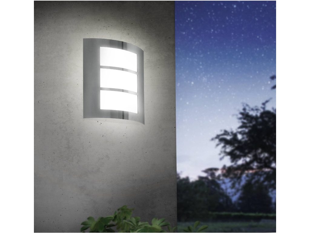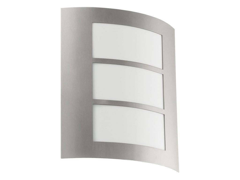 Venkovní nástěnné svítidlo CITY je vyrobeno z mírně zakřiveného těla z nerezové oceli a tří bílých saténových plastových osvětlovacích ploch. Díky ochraně proti stříkající vodě (IP44) jej lze bez váhání používat venku. Bez ohledu na to, zda se jedná o vchod do domu, terasu nebo balkon, nástěnné svítidlo se díky svému nadčasovému designu hodí do nejrůznějších venkovních prostor. Lampa není součástí dodávky. Do venkovního svítidla je vhodná jakákoli žárovka s paticí E27.