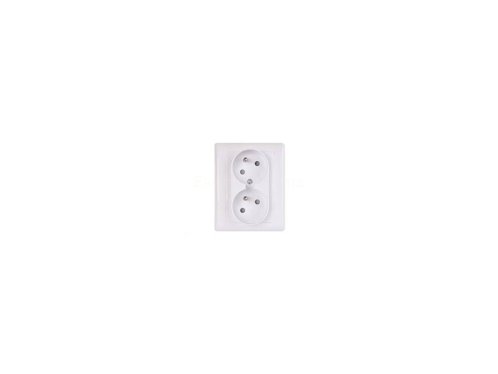 Kvalitní dvojnásobná FRENCH zásuvka s integrovanými dětskými clonkami. Montáž do krabice. IP20. Šroubové svorky. Dvě pootočené zásuvkové dutiny.