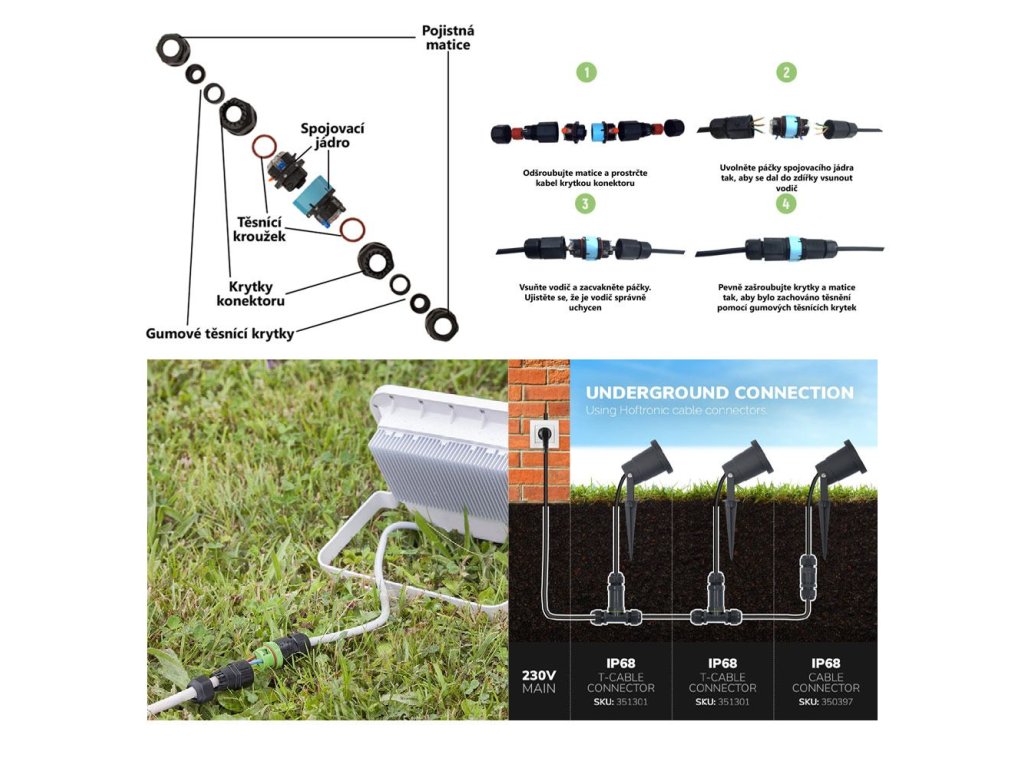 Kabelová vodotěsná spojka bezšroubová - rozbočka tvaru "I" pro vícežilové kabely s krytím IP68. Vhodná pro venkovní použití, např. pro připojení reflektorů.