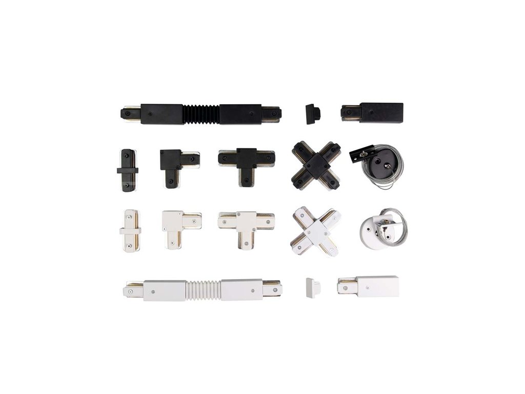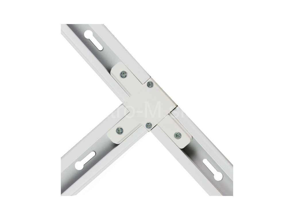 Lištový konektor pro montáž 1fázových osvětlovacích lišt DPM v pravém úhlu . Konektor „T“ umožňuje vytvoření 3směrných rozvětvených linek osvětlení na zeď nebo strop. Konektory kolejnic přenášejí napětí na další kolejnici z napájecího konektoru namontovaného na první kolejnici v řetězci.