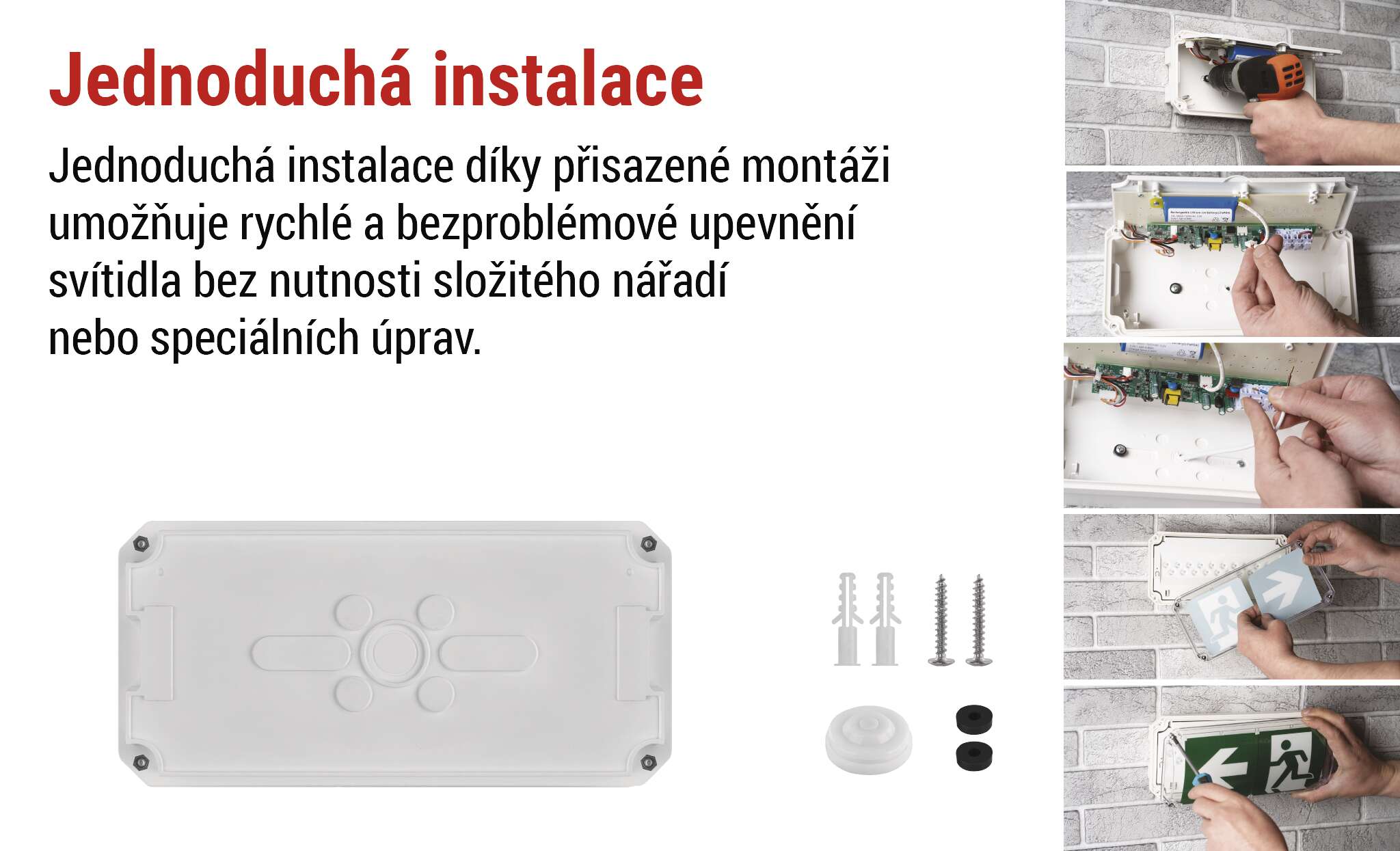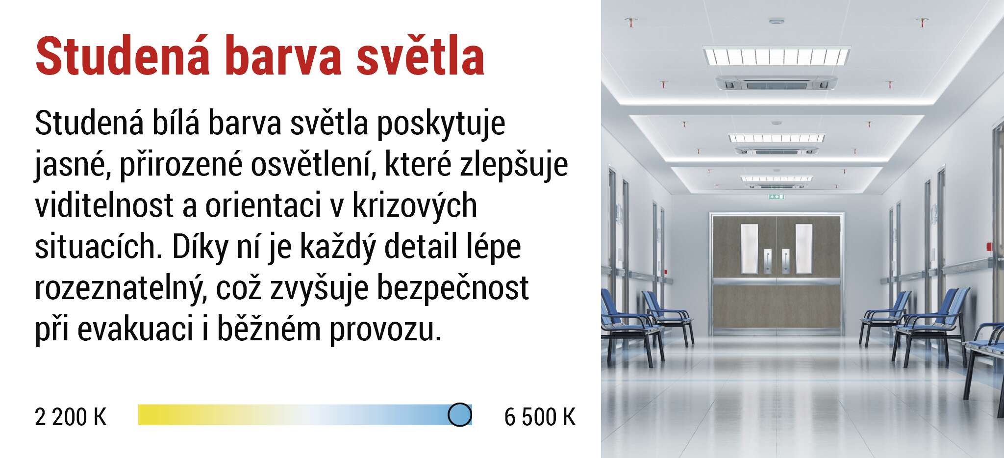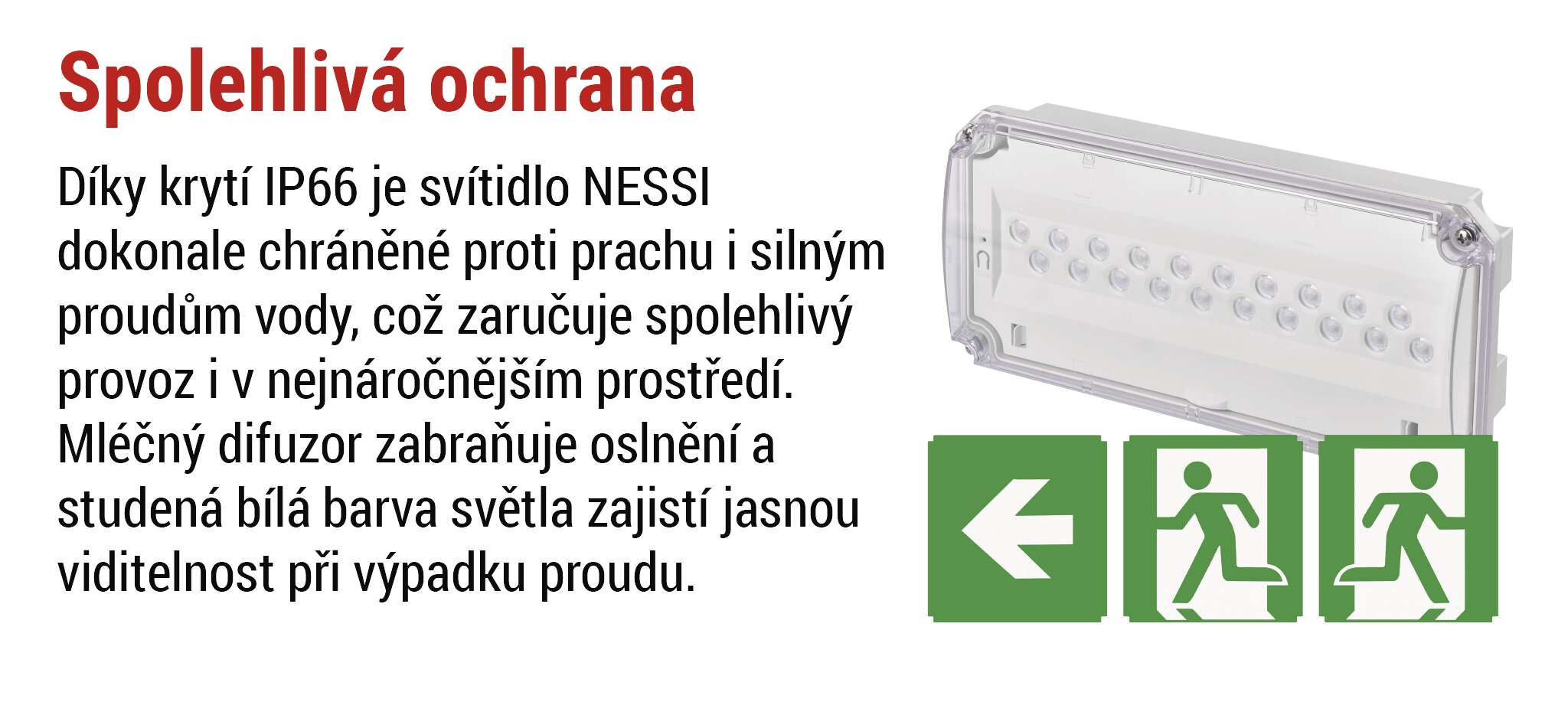 Díky studené bílé barvě světla poskytuje jasné a kontrastní osvětlení, které zajišťuje bezpečnou orientaci a maximální viditelnost na únikových cestách i venku.
