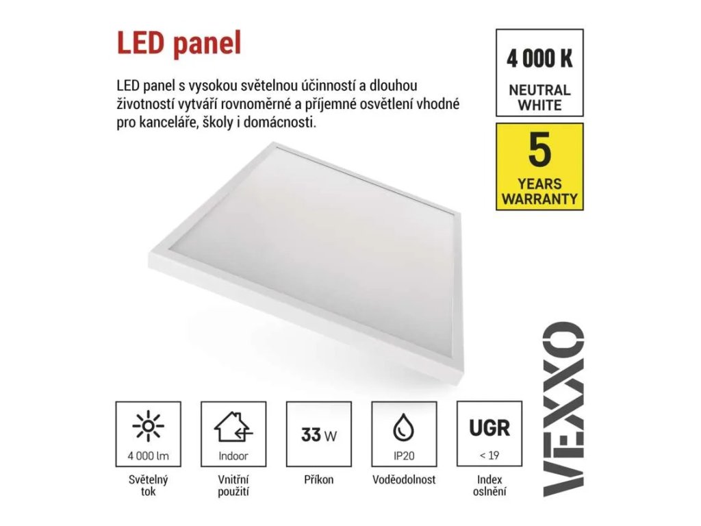 Světlovodivá deska (LGP) je odolná proti žloutnutí vlivem UV záření. Pevné hliníkové tělo spolu s dlouhou životností 50 000 hodin podporují dlouhodobou kvalitu LED panelů VEXXO, o čemž svědčí také prémiová záruka 5 let.