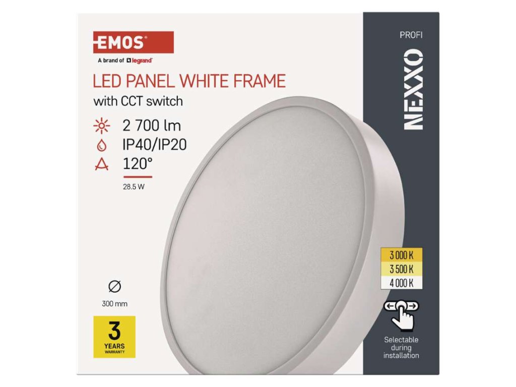 Svítidla NEXXO umožňují nastavit teplotu světla pomocí CCT přepínače. Během montáže se tak můžete rozhodnout, zdali se vám do interiéru hodí více teplá či neutrální bílá. Výjimkou jsou vestavná svítidla v bílé barvě, která mají teplotu chromatičnosti danou bez možnosti změny.