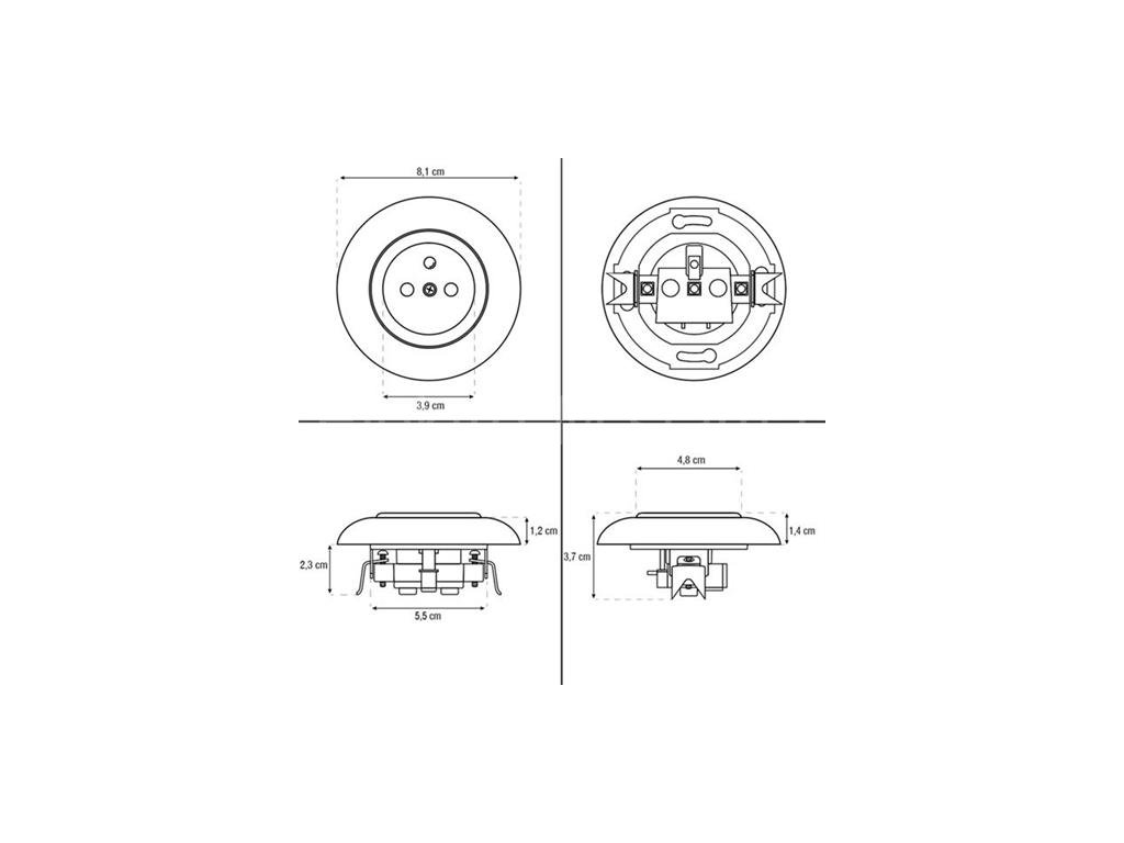 Zásuvka typu E (francouzská) s proudovou clonou zajišťující dokonalou ochranu před úrazem elektrickým proudem. Kulatá jednoduchá zásuvka s rámem se perfektně hodí jak do moderních interiérů v podkroví, tak do pokojů v retro stylu.