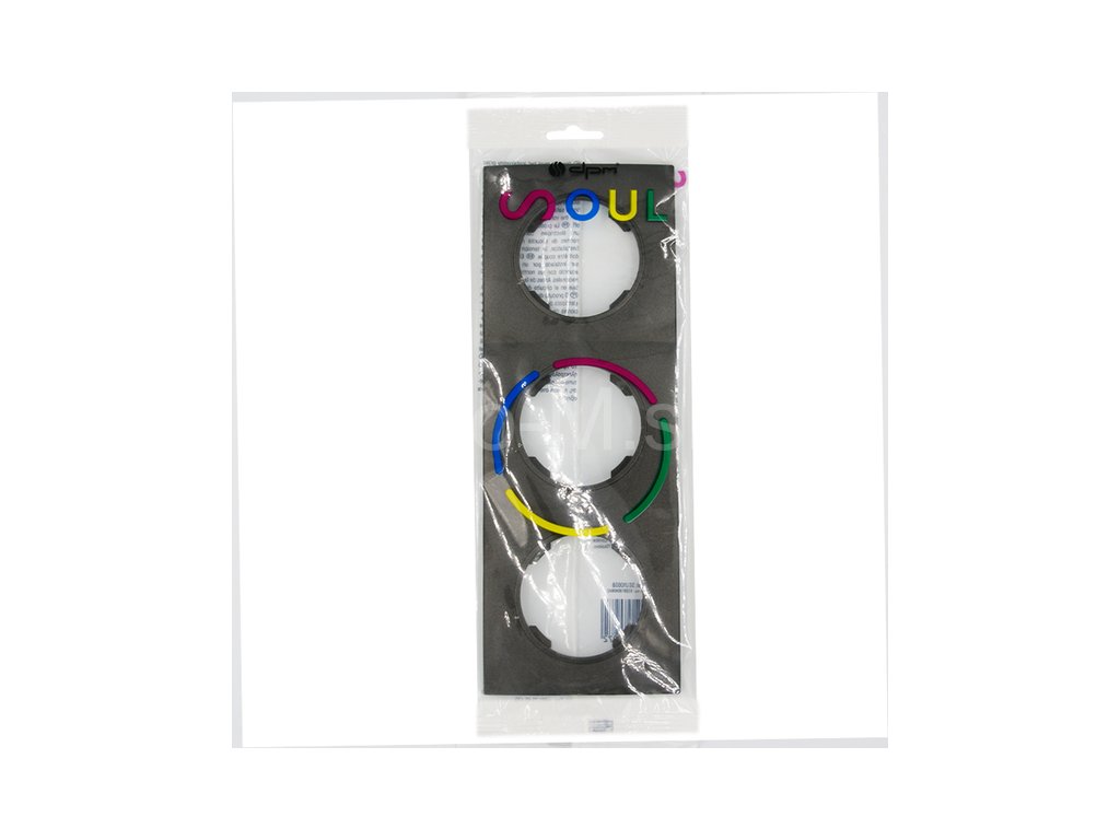 3-násobný rámeček slouží k estetické ochraně vypínačů a zásuvek. Obdélníkový rám je vyroben z kvalitního plastu s přední částí z černého skla . Místa určená pro montáž zařízení jsou zakončena kovovým lemem, který dává vyniknout zásuvkám a vypínačům. Rám se hodí pro jakýkoli typ vybavení SOUL. Skleněný rám je zabalen v kartonové krabici a ochranné fólii , aby se při přepravě nepoškodil. Díky nadčasovému vzhledu a stylu této série se rám dokonale hodí do každého typu interiéru.