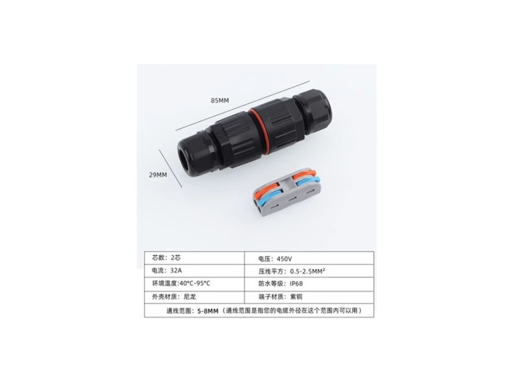 Vodotěsný obal:průměr kabelu: 6–10mmkrytí IP68Konektor:PCT-2–2 (2p)32A 250V0,08–2,5(4,0)mm2