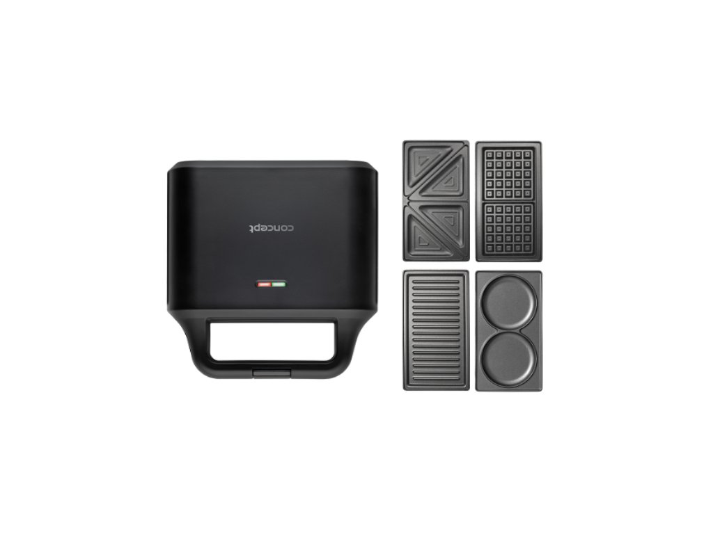Toustovač 4v1 Concept SV3055 v elegantním černém designu vám pomůže s rychlou přípravou snídaně, obědu, svačiny i večeře. Díky čtyřem vyměnitelným deskám nabízí široké využití. Stačí si jen vybrat, na co máte zrovna chuť. V jednom těle získáte hned čtyři praktické pomocníky, kteří vám v kuchyni zaberou minimum místa.