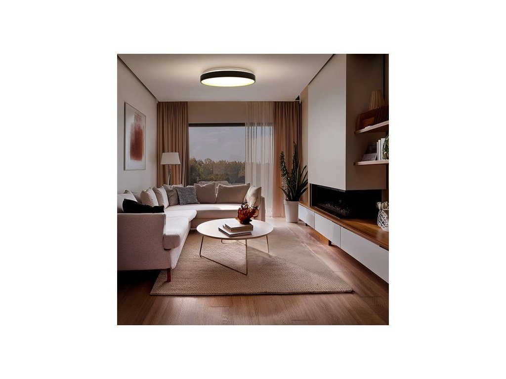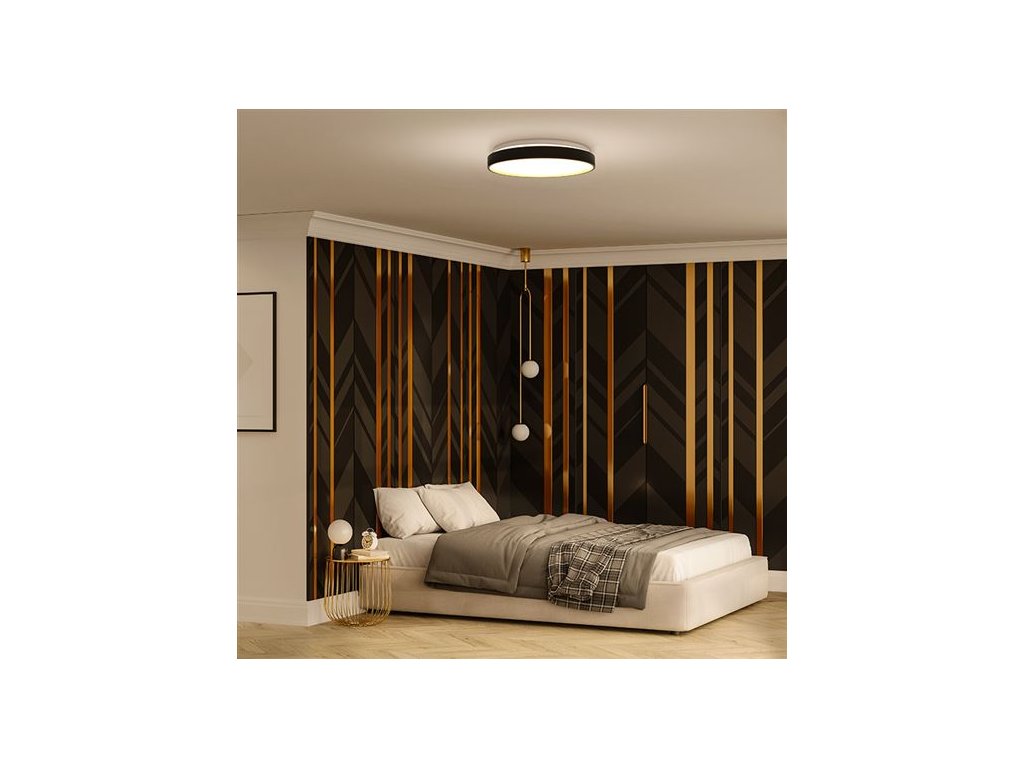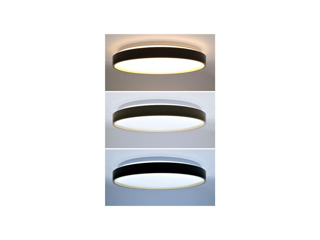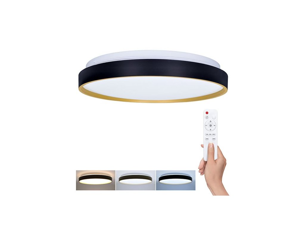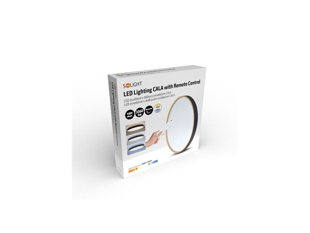 LED svítidlo Cala přináší do interiéru designový kontrast díky kombinaci černé a zlaté barvy. Ovládání pomocí dálkového ovladače umožňuje přepínání mezi teplotami světla 3000K, 4000K a 6500K, včetně možnosti plynulého stmívání. Při příkonu 48 W dosahuje světelný tok až 3360 lm (pro 4000K).