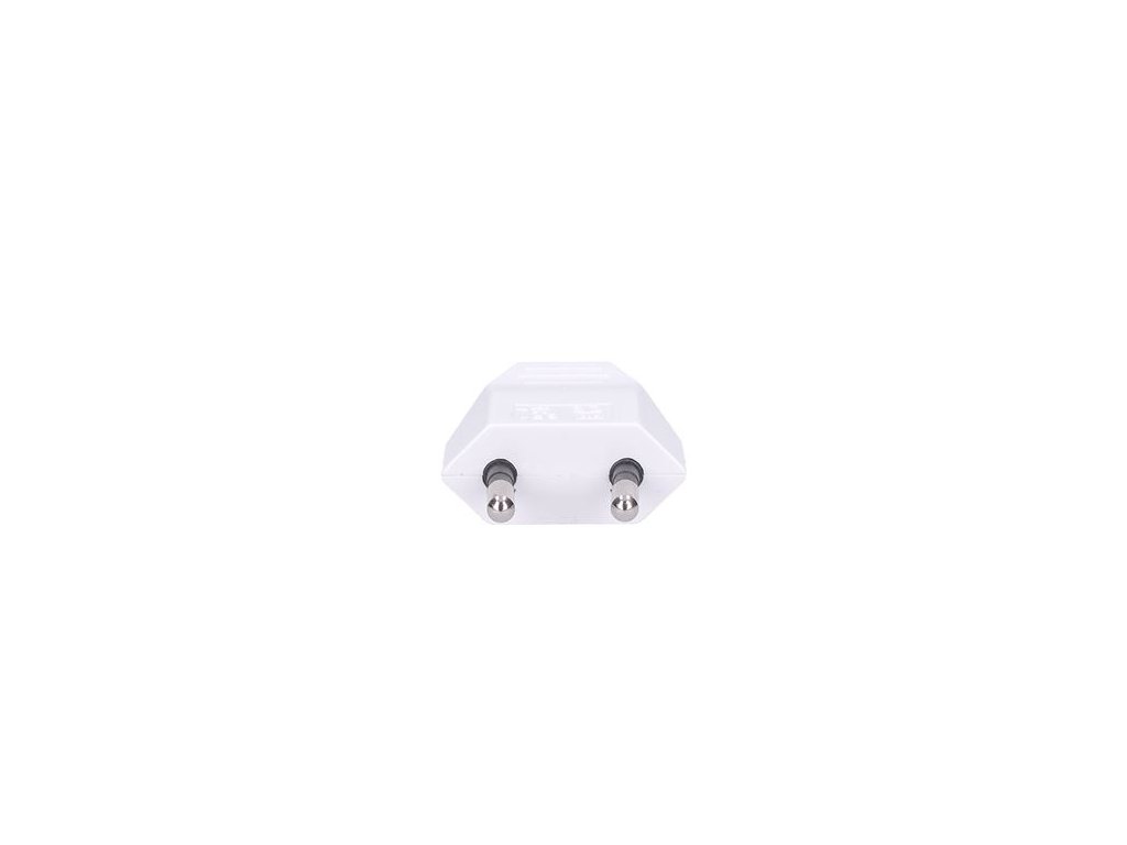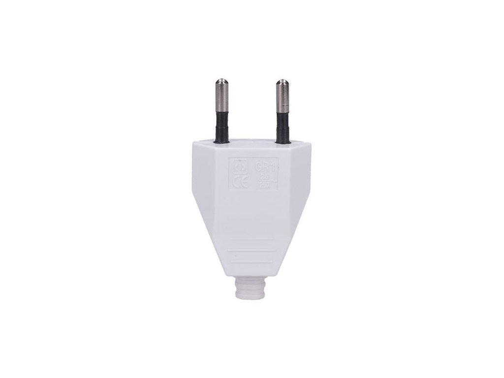 2P plochá zástrčka bez uzemnění, odnímatelná. AC 250 V ~, max. 2,5 A (625 W). Bílá barva.