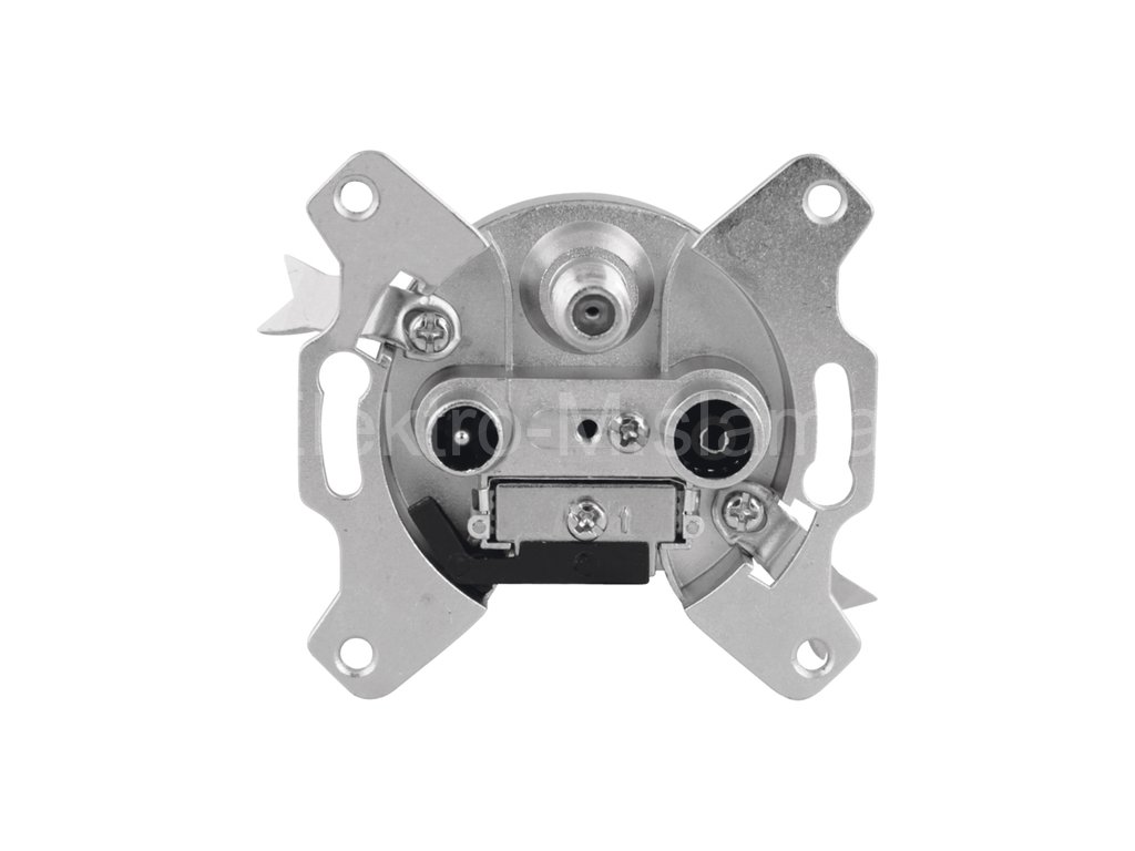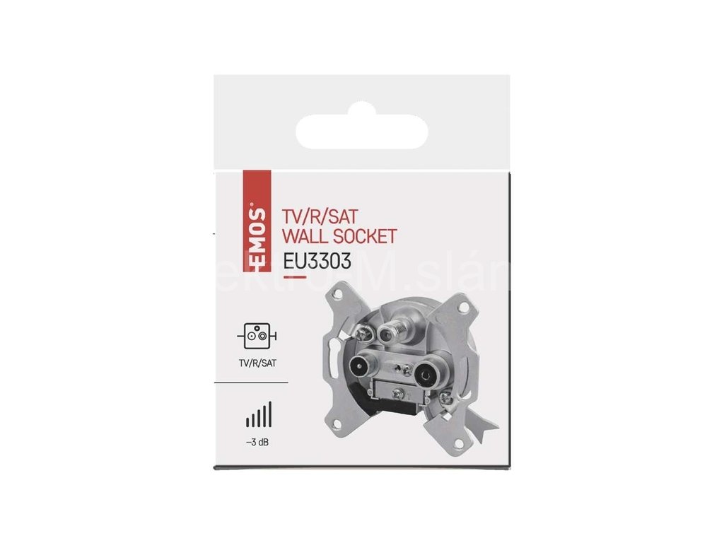 Účastnická zásuvka EU 3303 satelitní koncová s útlumem 3 dB a zdířkami pro TV + Rádio + SAT. Účastnická zásuvka propojuje např. anténu s televizí, satelitem nebo set-top-boxem. SAT zdířka průchozí pro stejnosměrné napětí a lze ji také využít pro průchod napájení předzesilovače v terestrické anténě.
