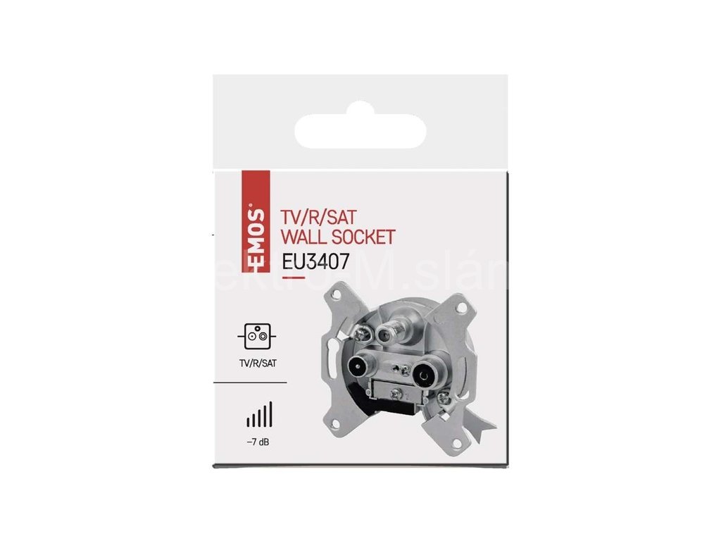 Účastnická zásuvka EU 3407 průběžná s odbočným útlumem 3 dB, průchozím útlumem 7 dB a zdířkami TV + R + SAT. Účastnická zásuvka propojuje např. anténu s televizí, satelitem nebo set-top-boxem. SAT zdířka průchozí pro stejnosměrné napětí a lze ji také využít pro průchod napájení předzesilovače v terestrické anténě.