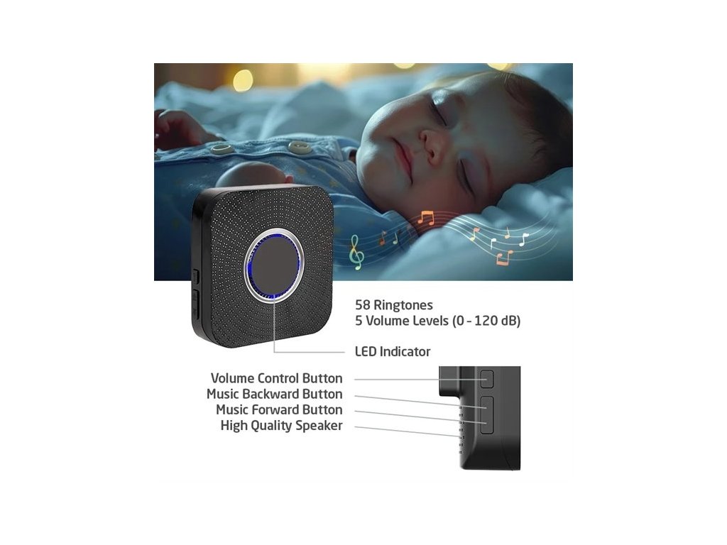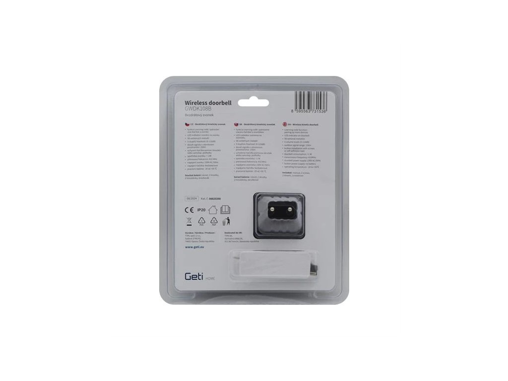 Na tento výrobek poskytujeme 3 roky záruku. Spolehlivý zvonek GETI GWDK108B se hodí nejen k domu či bytu, ale také do kanceláří, továren či recepčních hal. Hlavní výhodou je, že tlačítko nevyžaduje žádné baterie ani externí napájení, protože energii potřebnou k jeho provozu generuje samotný pohyb stisknutí tlačítka. Tím se eliminuje nutnost pravidelné výměny baterií, což je ekologické a úsporné řešení. Velkou předností tohoto zvonku je také jeho bezdrátové provedení s dosahem až 150 m ve volném prostoru. Instalace zvonku je velmi snadná, spárování mezi vysílačem a zvonkem probíhá automaticky. Funkce LEARNING CODE navíc umožnuje vzájemné spárování více tlačítek a zvonků. Zvonek má jednoduchý moderní design, 5 stupňů hlasitosti a výběr z 58 vyzváněcích melodií. Velkou výhodou zvonku je zapamatování si nastavené melodie a hlasitosti i po odpojení přístroje od elektrické sítě.